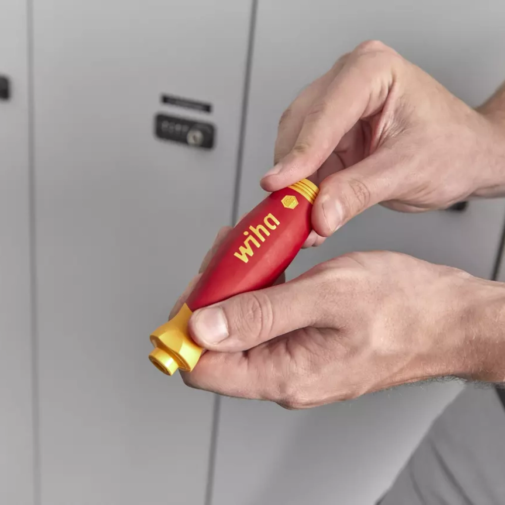 PocketMax® compact și ușor de la Wiha se potrivește convenabil în orice buzunar de cămașă sau pantalon și este însoțitorul ideal pentru fiecare electrician. Depozit în siguranță în mâner, depozitul de biți include patru slimBits. Datorită funcției de închidere magnetică, depozitul de biți poate fi deschis foarte ușor pentru a îndepărta slimBits. Prin urmare, căutarea piesei potrivite este de domeniul trecutului. În timpul închiderii, depozitul de biți alunecă ușor și ușor înapoi în arbore și practic se închide de la sine datorită magnetului. Capacul răsucibil aduce un alt avantaj, asigurând o manevrare convenabilă. PocketMax® electric asigură, de asemenea, siguranță maximă. Atât suportul pentru biți pentru magazie, cât și slimBits-urile pe care le conține sunt certificate conform standardului internațional IEC 60900. SlimBits subțiri de 75 mm asigură accesul perfect la șuruburile joase sau clemele cu arc datorită izolației de protecție complet integrate în biți din secțiunea frontală.